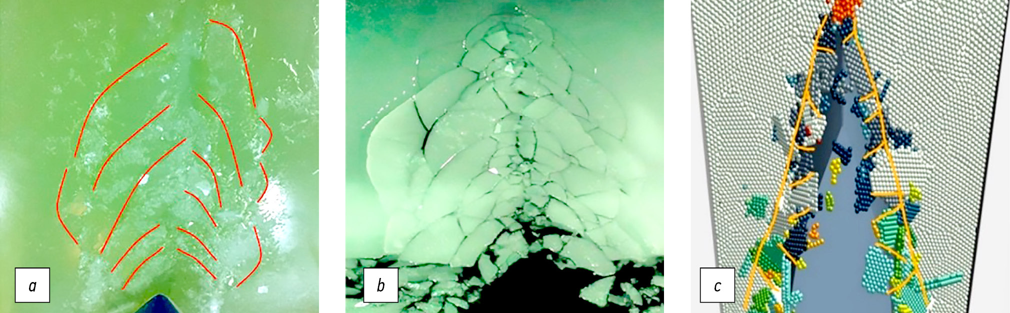 Fig. 3. Comparison of ice damage between model tests [24]: a, b, experiment; c, numerical modeling.