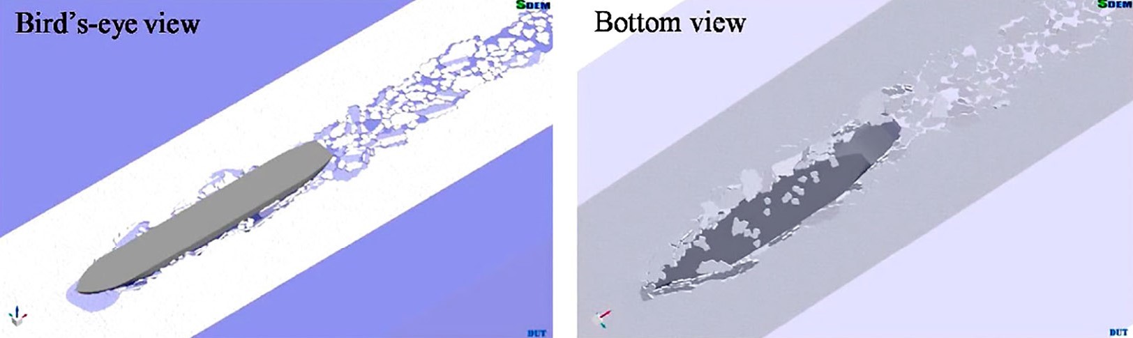 Рис. 4. Моделирование навигации судна в плоском льду с помощью FEM–DEM [26].