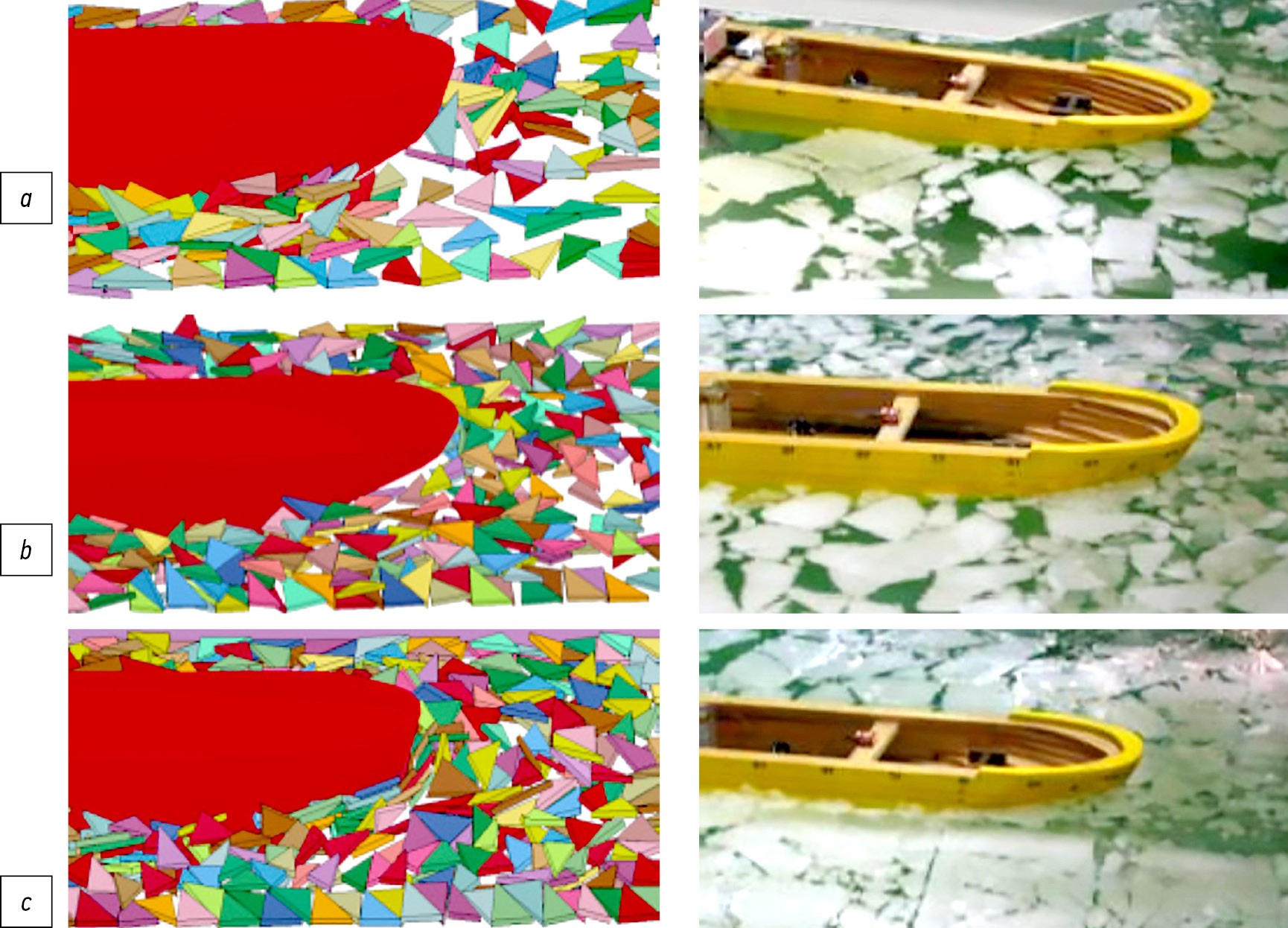 Fig. 5. Numerical ship model compared to a model experiment with different ice concentrations [9]: a, 60%; b, 80%; c, 90%.