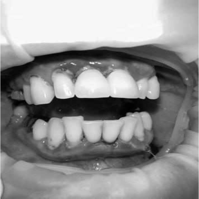 За пародонтологическим лечением обратилась женщина 61 года с жалобами на неприятный запах из полости рта, кровоточивость десен при чистке зубов, подвижность зубов, несостоятельность ортопедических конструкций.