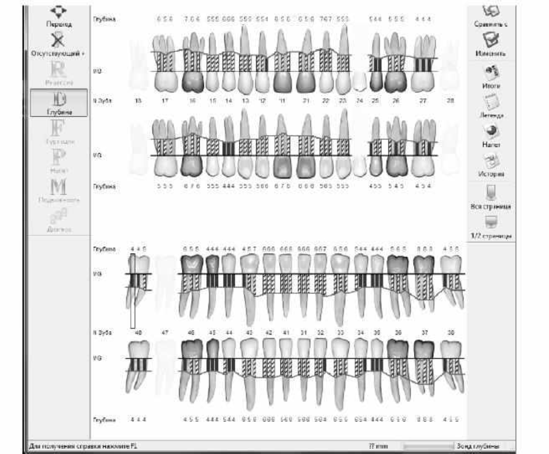 Учитывая, что достаточно большое количество показателей необходимо отметить в пародонтальной карте пациента, был создан программно-диагностический комплекс Florida Probe (Florida Probe Corporation, США). Он состоит из программного обеспечения, электронного зонда и ножного переключателя, с помощью которого фиксируется глубина зондирования, кровоточивость и гноетечение. Компьютер воспроизводит голосовое сообщение о наличии кровоточивости десен, глубине кармана, гноетечении и подвижности зубов. После проведения зондирования программа составляет пародонтограмму, в которой будут указаны все необходимые данные о состоянии пародонта. Отметив зубы с имеющимся зубным налетом, программа посчитает гигиенический индекс. Плюсом использования данной программы является то, что в ней сохраняются предыдущие исследования, что необходимо для оценки успеха лечения и динамики заболевания. Наглядная демонстрация результатов обследования повышает мотивацию для пациента. Также в программе имеются информационные видеоролики для пациента [9, 10].