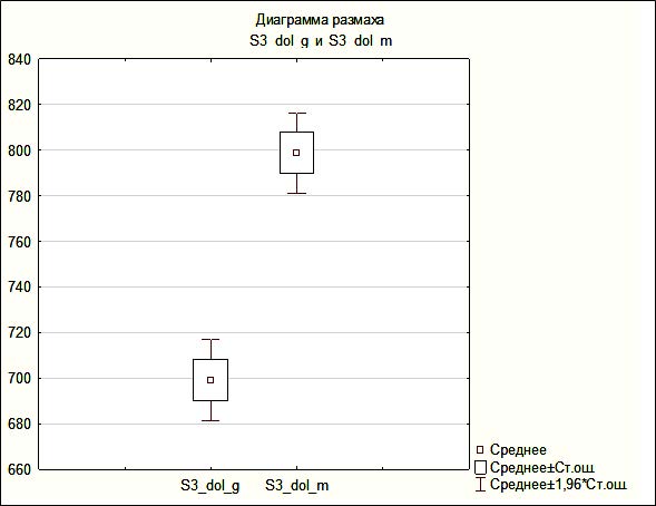 Среднее значение сектора S3 составило у девушек 699,01 мм², а у юношей – 798,82 мм². Минимальное для девушек – 539,07 мм², а для юношей – 577,6 мм². И максимальное значение распределилось таким же образом: у девушек значение ниже – 912,96 мм², а у юношей выше – 1059,42 мм². Соотношение площади сектора S3 аналогично сектору S2: меньше у девушек, больше у юношей.