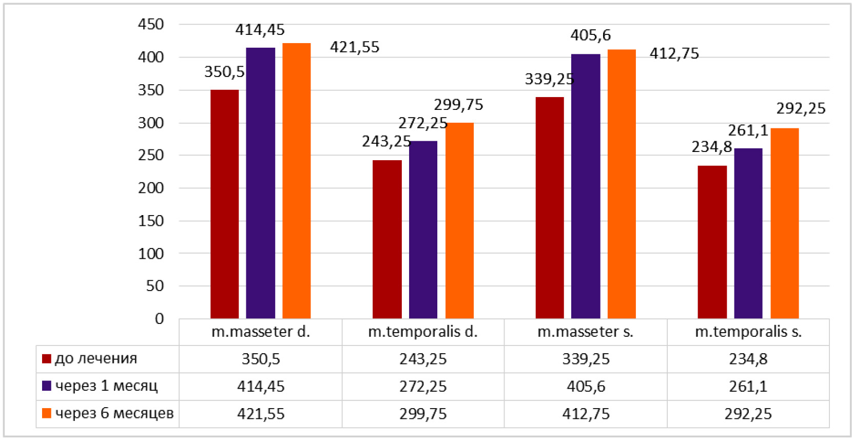 В основной группе показатели через 6 месяцев при максимальном сжатии челюстей средняя амплитуда электромиографии в мкВ составила: для правой стороны собственно жевательной мышцы 461,45 ± 4,5 и височной мышцы 324,9 ± 6,71; для левой стороны собственно жевательной мышцы 442,90 ± 7,91 и височной мышцы 309,65 ± 5,65.