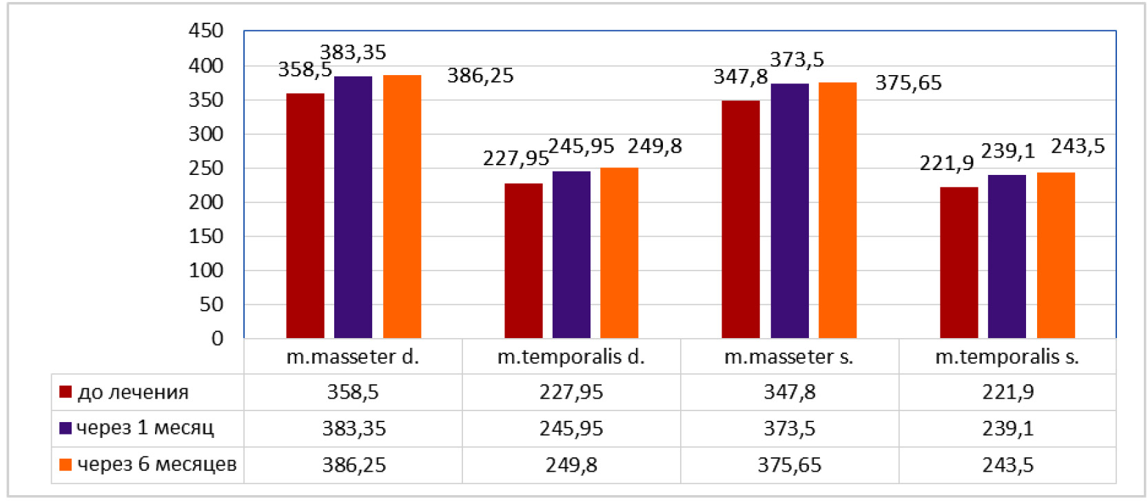 Через 1 месяц после лечения получили, что в основной группе средняя амплитуда электромиографии в мкВ составила: для правой стороны собственно жевательной мышцы 454,65 ± 2,50 и височной мышцы 304,9 ± 5,84; для левой стороны собственно жевательной мышцы 434,9 ± 5,84 и височной мышцы 296,65 ± 2,41. Через 1 месяц после лечения получили, что в контрольной группе средняя амплитуда электромиографии в мкВ составила: для правой стороны собственно жевательной мышцы 374,8 ± 10,42 и височной мышцы 291 ± 9,42; для левой стороны собственно жевательной мышцы 351,4 ± 12,24 и височной мышцы 273,1 ± 8,44 (при p < ,05).