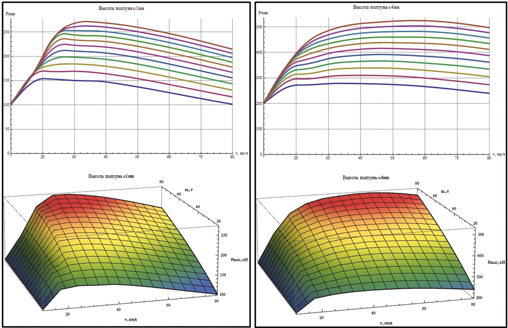 В результате обработки полученных расчетных данных определялась максимальная (пиковая) сила удара, на основе которой были построены трехмерные графики для ползунов 0,5, 1, 2, 3, 4 мм. На представленных графиках отслеживается характер изменения максимальной силы удара в зависимости от скорости движения и массы вагона. Для определения диапазона скоростей, при которых значения удара максимальны было дополнительно построено семейство двухмерных графиков. На рис. 3 показаны только результаты для ползуна 1 и 4 мм соответственно.
