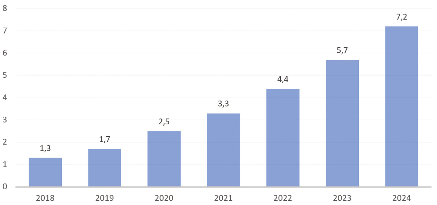Рис. 1. Динамика объема рынка e-commerce за 2018– 2024 гг., в трлн руб. [1]