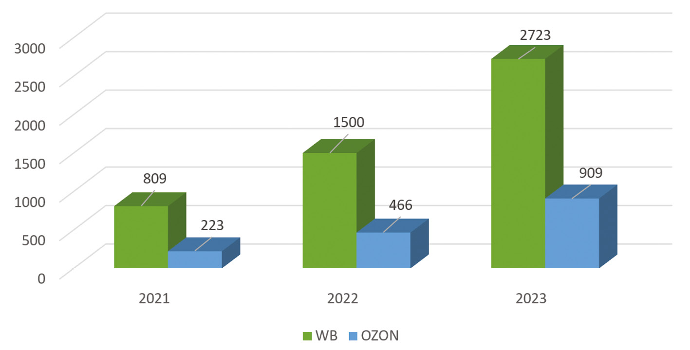 Рис. 2. Динамика соотношения количества заказов на WB и OZON 2021–2023 гг., в млн руб. [3]