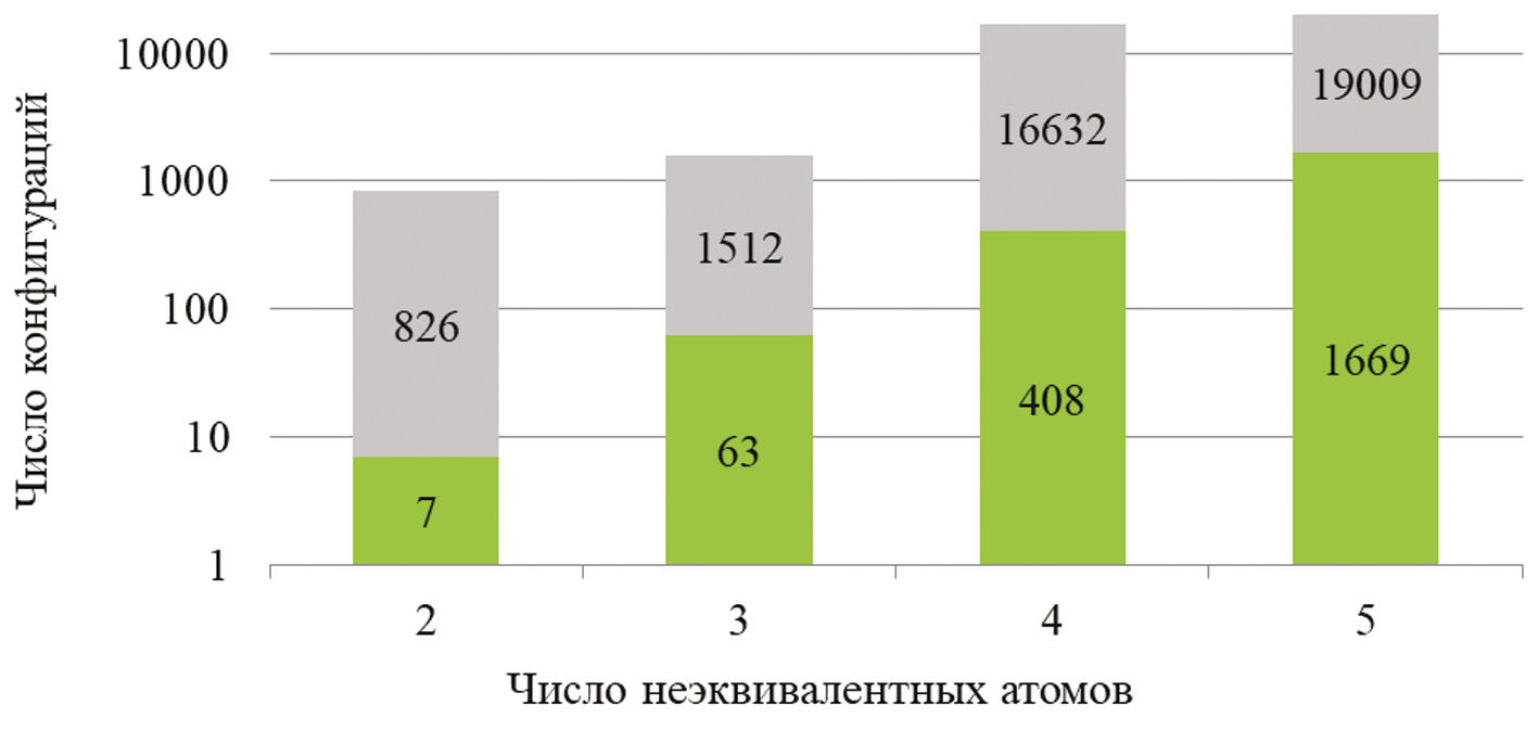 Одним из частных случаев данной задачи является моделирование высокоэнтропийных сплавов (ВЭС) [4, 5]. В классической модели ВЭС содержится пять и более компонентов в равных пропорциях, а атомы распределены по кристаллической структуре с одинаковой вероятностью. Это приводит к большому количеству возможных конфигураций. Мы сгенерировали все низкосимметричные копии fcu (ГЦК) сетки с 2, 3, 4 или 5 неэквивалентными узлами. В результате количество конфигураций с различными окружениями атомов оказалось значительно меньше общего числа, что в свою очередь позволит существенно сократить объем последующего моделирования сплавов методами DFT (рис. 1).