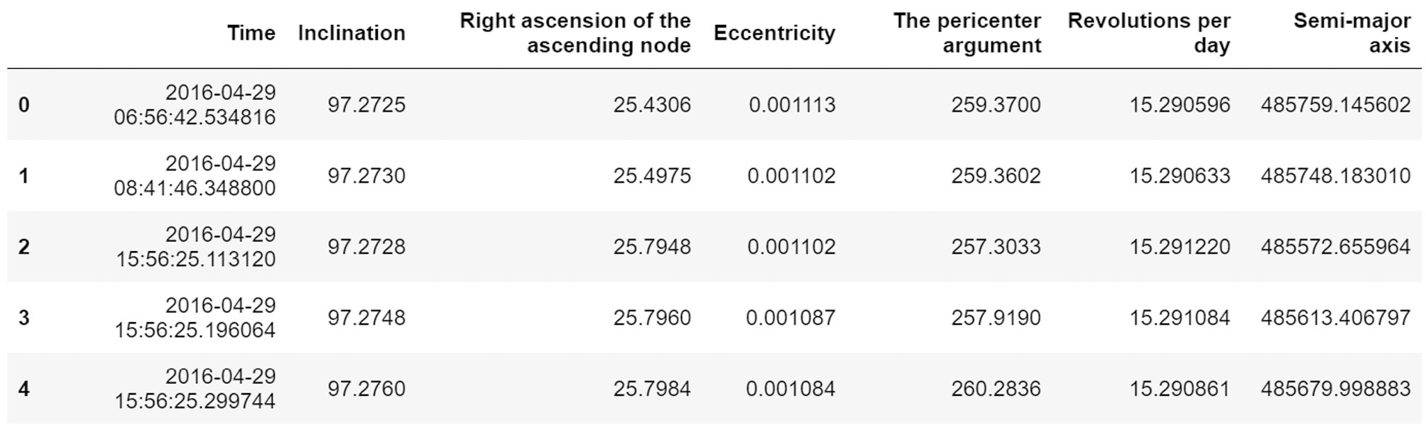 На основе данных TLE МКА «АИСТ-2Д» [1] была разработана специальная программа для обработки двухстрочных орбитальных элементов. В результате работы программы «сырые» данные преобразуются в удобную табличную форму, пример которой представлен на рис. 1.