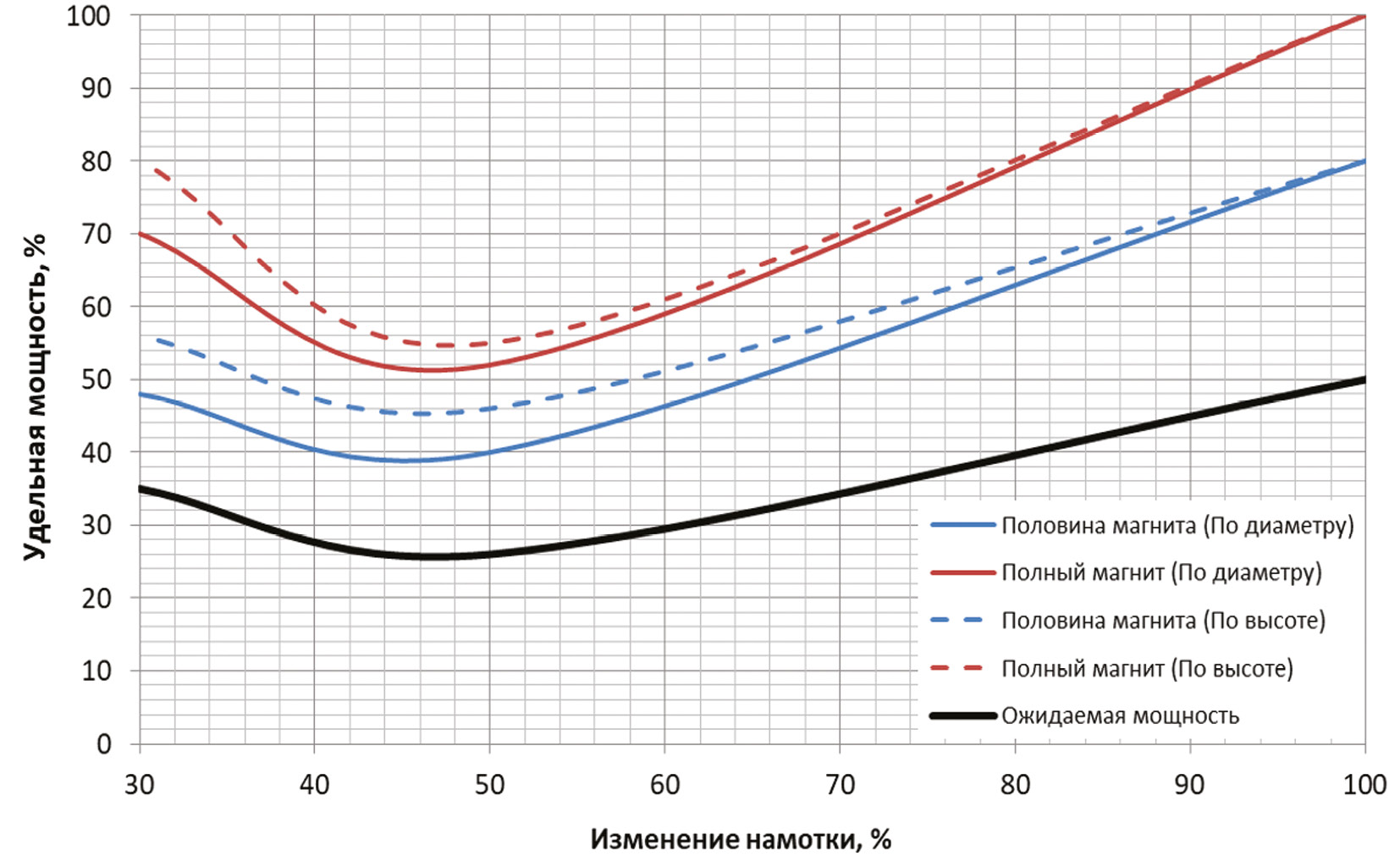 Как видно из рисунка, при уменьшении площади магнита в два раза общая мощность уменьшается на 15 %, вследствие чего увеличивается удельная мощность микрогенератора. Таким образом, изменение процента намотки проволоки как по высоте, так и по диаметру на удельную мощность влияет нелинейно, при этом с 30 % объема намотанной проволоки можно получить энергии как с 80 % намотки.