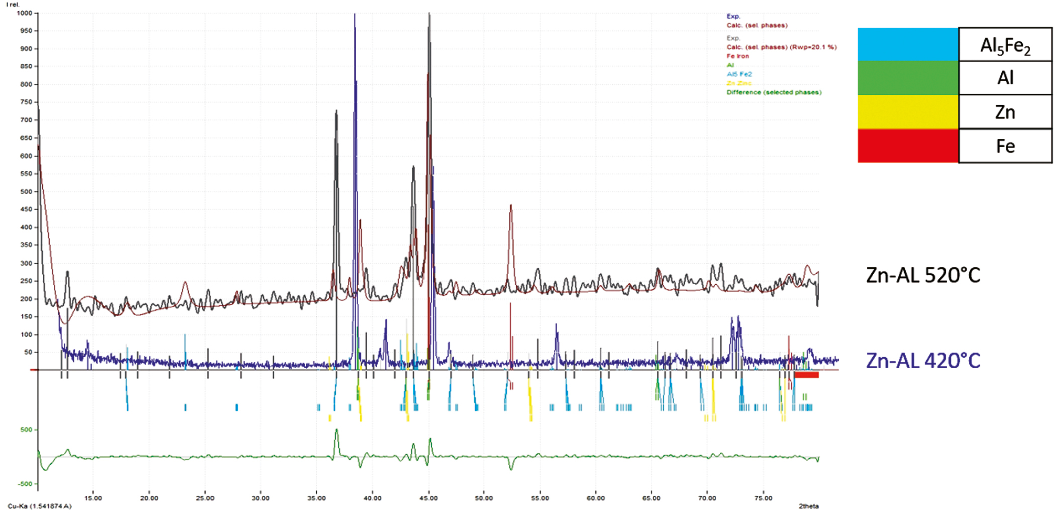 Обратившись к литературе [6] и тройной диаграмме состояния Zn-Al-Fe можно определить состав образующихся фаз, в нашем случае это η-Fe2Al5ZnX. Для идентификации фазы был проведен рентгенофазовый анализ, по результатам которого была получена зависимость интенсивности излучения от угла дифракции. На рис. 2 представлены дифрактограммы образцов, полученных при температуре цинкования 420 и 520 °C. В результате была идентифицирована фаза Al5Fe2 в покрытии, полученном при 520 °C, что подтверждает результаты спектрального анализа.