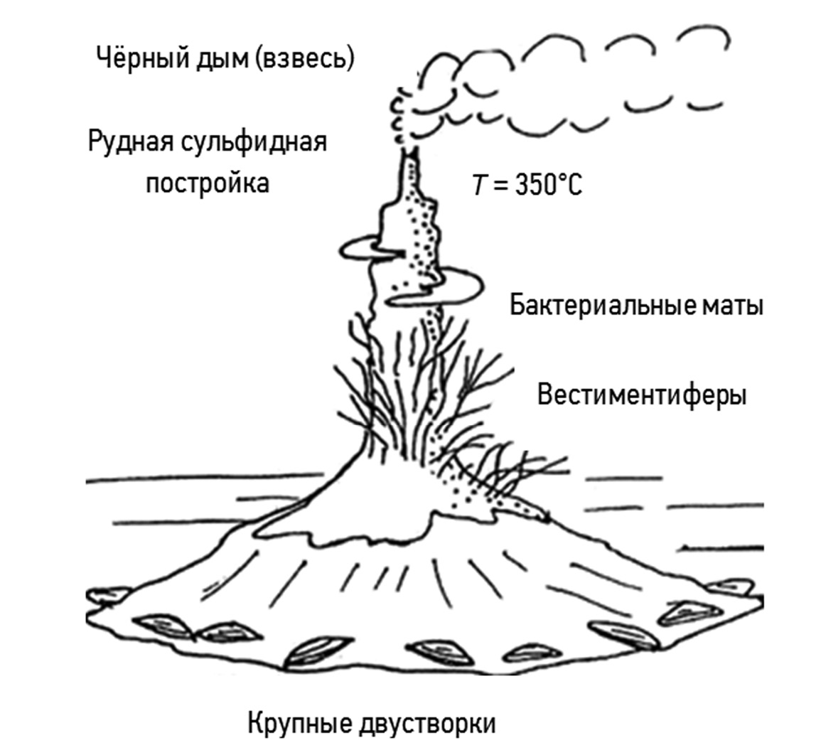 Одним из главных источников металлоносных осадков являются «черные курильщики». «Черные курильщики» — это гидротермальные источники, расположенные на дне океана, которые извергают горячую воду, насыщенную минералами и металлами (рис. 1). Они получили свое название из-за того, что из них выбрасываются черные облака частиц, содержащих сульфиды металлов, таких как медь, цинк и железо. Океаническая вода проникает сквозь трещины под землю, нагревается раскаленными породами литосферы и накапливает в себе различные химические элементы. После этого горячая насыщенная смесь находит выход в другом месте океана и образует подобие гейзеров, которые ученые назвали «курильщиками».