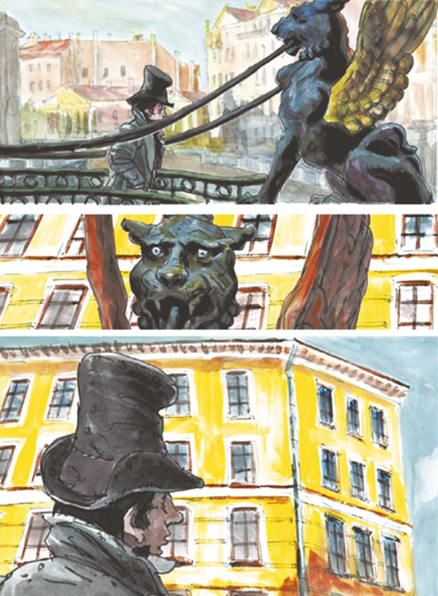 1. Иконическое дополнение. Изображение иллюстрирует, конкретизирует или дополняет вербальное сообщение [1]. Например, в комиксе Д. Чухрая «Преступление и наказание» пейзаж Петербурга с его безлюдными улицами и «преогромнейшим» домом давит на Раскольникова, отражая его душевное состояние и предопределяя трагедию (рис. 1).