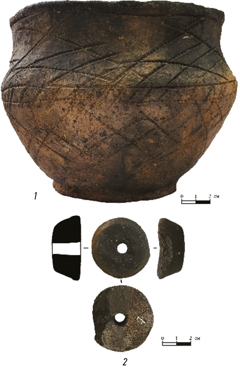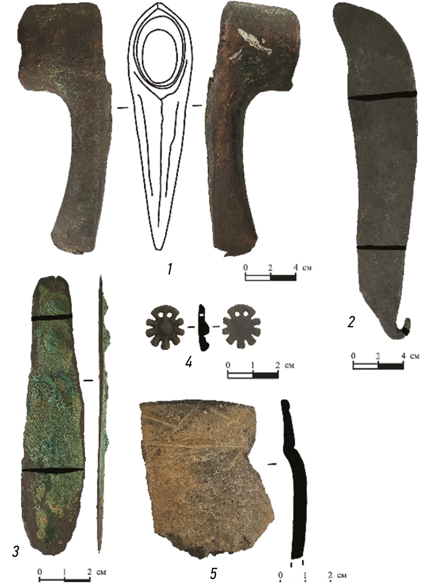 Результаты. Отобранные из фондов предметы представлены: массивнообушным топором, серпом, ножом, бляшкой, сосудом, фрагментом керамики и пряслицем. Бронзовый вислообушный топор (рис. 1, 1) был передан в музей в 2017 году. Топор найден в 2,5 км севернее села Никольское-на-Черемшане. В 10 км северо-восточне от с. Никольское-на-Черемшане, в селе Ерыклинск был найден серп дербеденевского типа (рис. 1, 2). Такие серпы датируются по дербеденевскому кладу последней четвертью II тыс. до н. э. [1, с. 46]. Нож двулезвийный с короткой слабо выделенной рукоятью (рис. 1, 3). Найден в районе села Никольское-на-Черемшане. Клинок имеет листовидную (обратнолацентную) форму. Розетковидная бляшка абашевской культуры (рис. 1, 4) была найдена в районе села Никольское-на-Черемшане. Бляшка-розетка семилепестковая, подовальной формы. Фрагмент венчика сосуда (рис. 1, 5) был найден в районе села Белый Яр и отнесен нами к керамике займищенского типа памятников. Данный тип керамики датируется XVI–XV вв. до н. э. Сосуд срубной культуры горшковидной формы (рис. 2, 1) был передан в музей в 2005 году. Местоположение и обстоятельства обнаружения находки неизвестны. Глиняное пряслице усеченно-конической формы (рис. 2, 2) найдено в районе села Никольское-на-Черемшане. Усеченно-конические глиняные пряслица известны на поселениях срубной культуры, что дает возможность отнести экспонат из ДКМ к этой культуре.