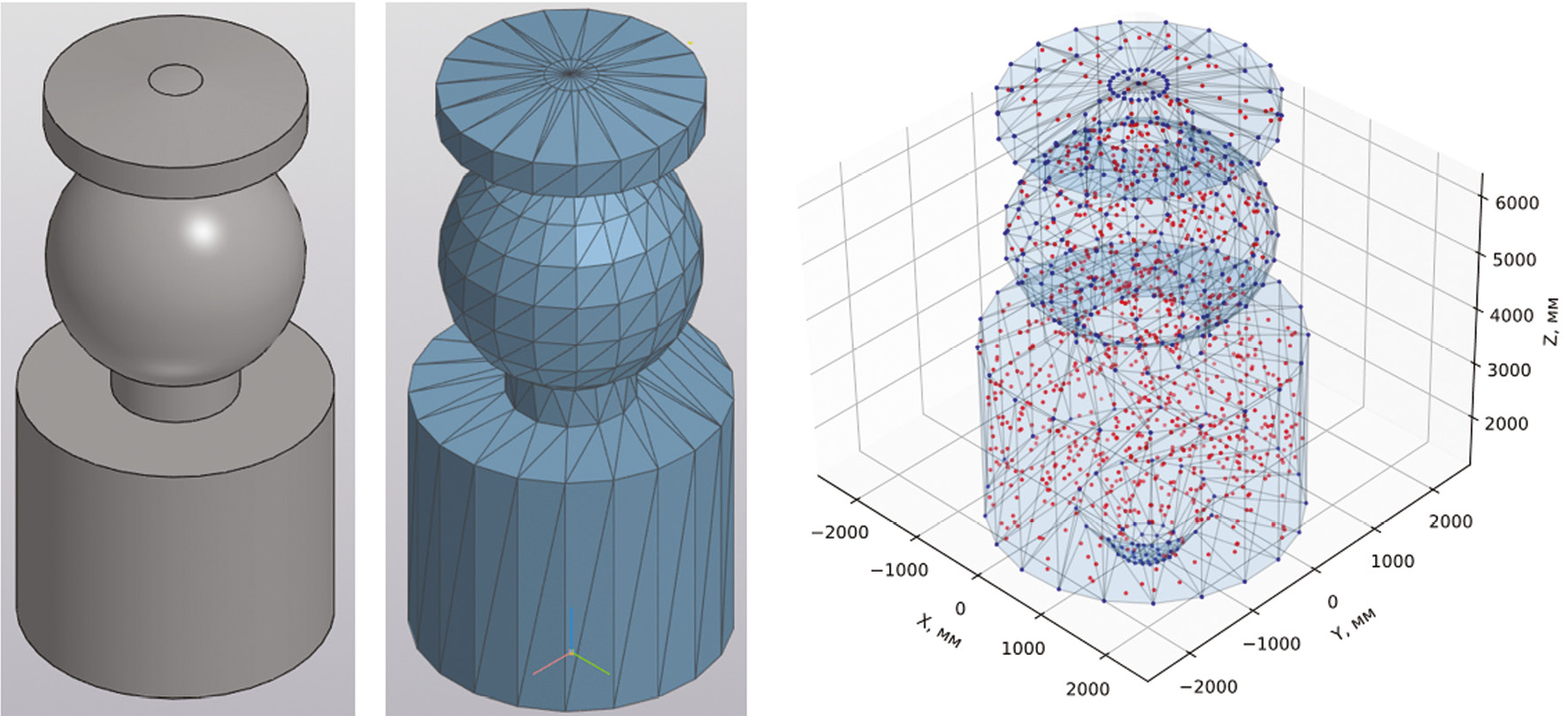 Рис. 1. Этапы преобразования модели слева направо: твердотельная модель, STL-модель, набор точек